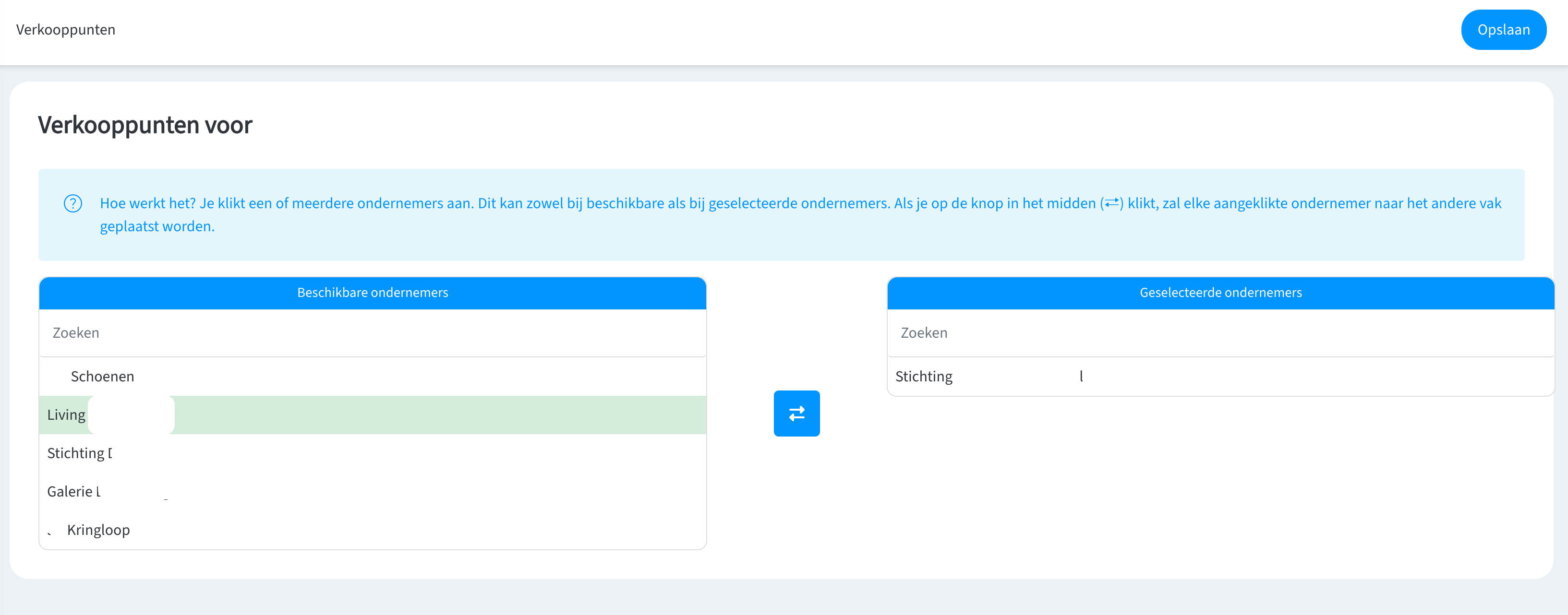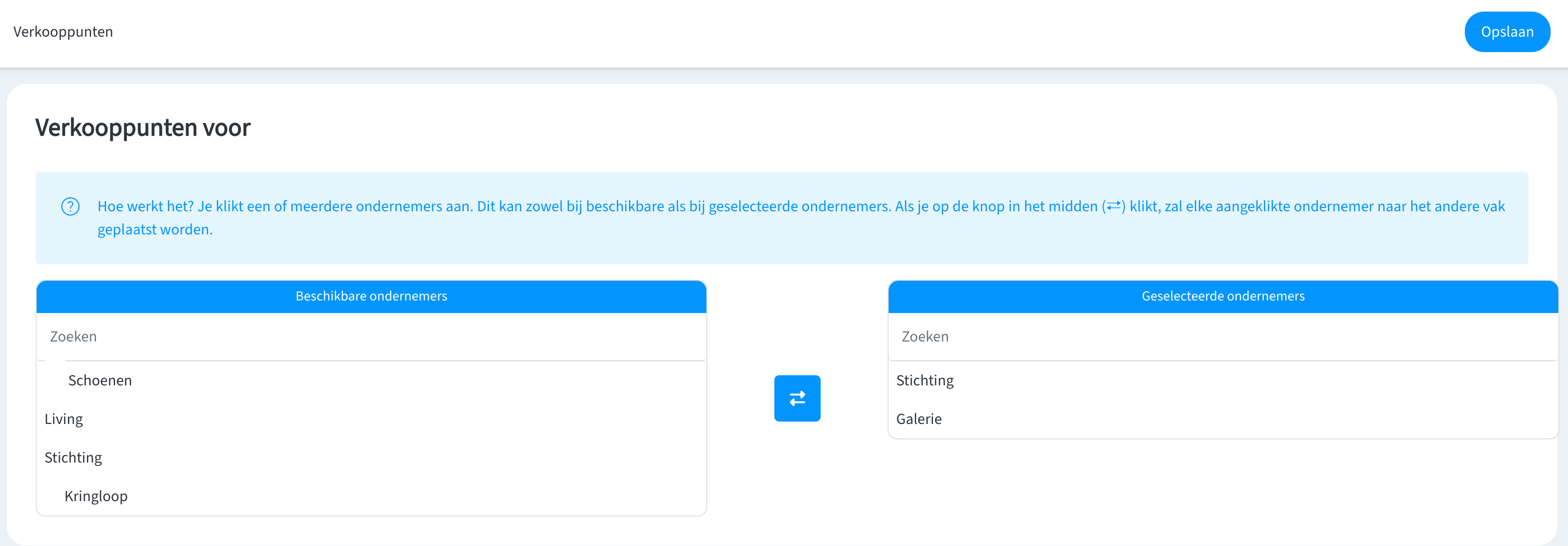 3. In de linkerkolom 'Beschikbare ondernemers' kan je de ondernemer(s) selecteren die als verkooppunt ingesteld moeten worden.