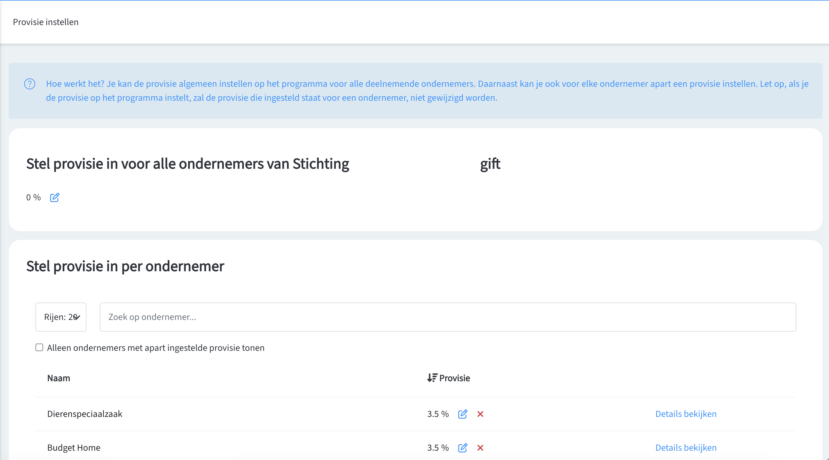 3. Op deze pagina heb je de keuze om de provisie algemeen in te stellen op het programma voor alle deelnemende ondernemers of voor elke ondernemer apart.